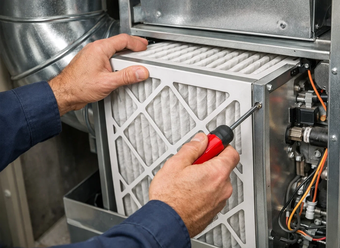 HVAC technician installing a high-efficiency air filter as part of an advanced indoor air quality system.